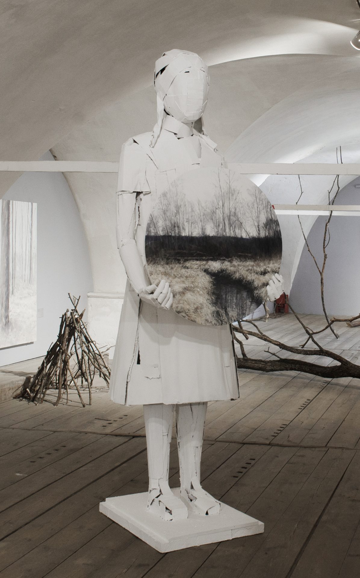 Егор Плотников. Из диптиха «В центре внимания». 2017, папье-маше, бетон, акрил. Экспозиция выставки «Юго-Запад»