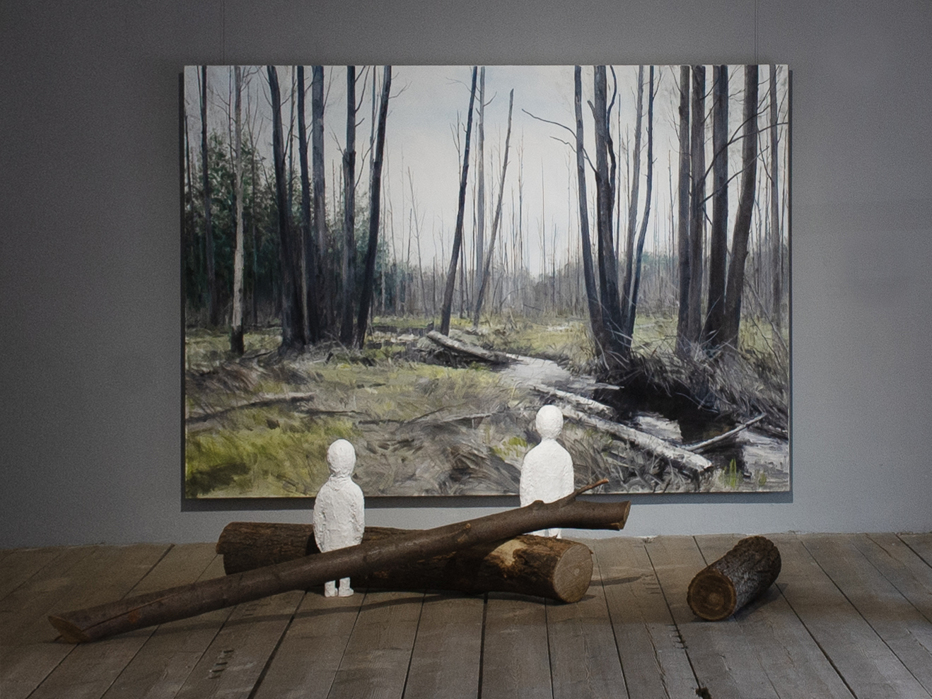 Plotnikov Egor. On the bank. 2022, oil on canvas, 150×200, papier-mache, wood, acrylic, 20x200x15